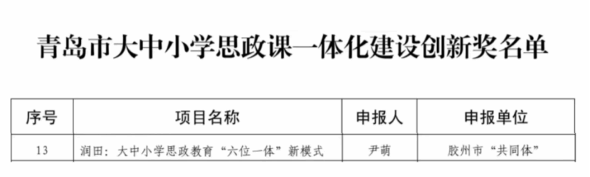 尹萌老师主持的《润田:大中小学思政教育“六位一体”新模式》项目,荣获青岛市大中小学思政课一体化建设创新奖。该项目立足区域思政教育整体布局,探索构建了“课程共建、师资共育、资源共用、教研共进、评价共促、文化共融”的“六位一体”育人机制,为推动大中小学思政教育有效衔接、协同发展提供了可复制的实践路径。
