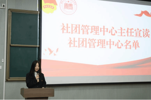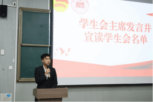 学生会副主席郑锦浩上台发言并宣读了新一届学生会成员名单,明确了学生会各部门的职责与分工。