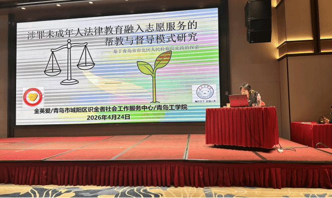 会上,金英爱教授立足青少年法治教育、司法社会工作、涉罪未成年人帮教帮扶、社区实践育人等研究方向,结合阶段性科研成果与青岛市北区未检帮教实践经验,作专题交流发言。她以《涉罪未成年人法律教育融入志愿服务的帮教与督导模式研究》为题,全面阐释“法治教育内嵌志愿服务”特色实践模式,详细介绍“三阶一体”服务架构与“三级四维”督导运行体系,充分展现了社会工作专业实务与青少年思想政治教育、法治教育深度融合的创新路径与实践成效,也为其主持的本次“攀登计划”立项课题研究夯实了实践依据与实证支撑。